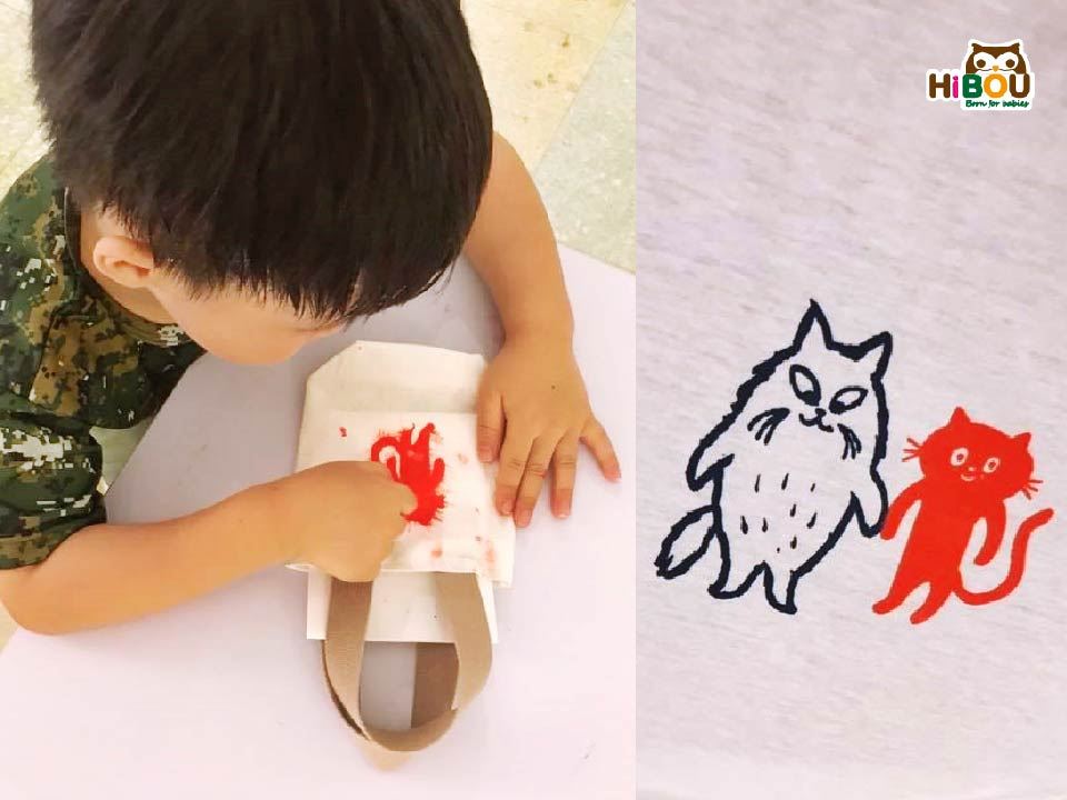 首先老師請大家自備棉或麻材質的衣服、包包或是布塊,再將已印上老師作品的孔版擺在想印上圖案的地方,塗上油墨後用力一刷,可愛的貓咪就現型了!超好玩的,小Rui也能很上手的做出漂亮的成品喔!