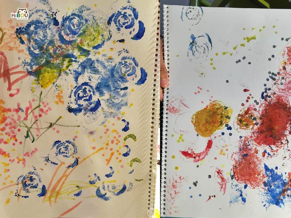 Rui三歲開始可以操作的道具越來越多,我們也越玩越有心得了,這時期他作品使用的素材跟工具也越來越多,也會偶爾拿起筆畫畫。畫畫的主題也是繞著生活和季節流轉,有時候我們用寶特瓶印出花瓣、有時候我們畫下雨天、偶爾我讓他畫點具象的形狀,並貼上眼睛做出小怪獸、有時候我們吹泡泡作畫。我依舊常常在網路上找很多新花樣來玩。